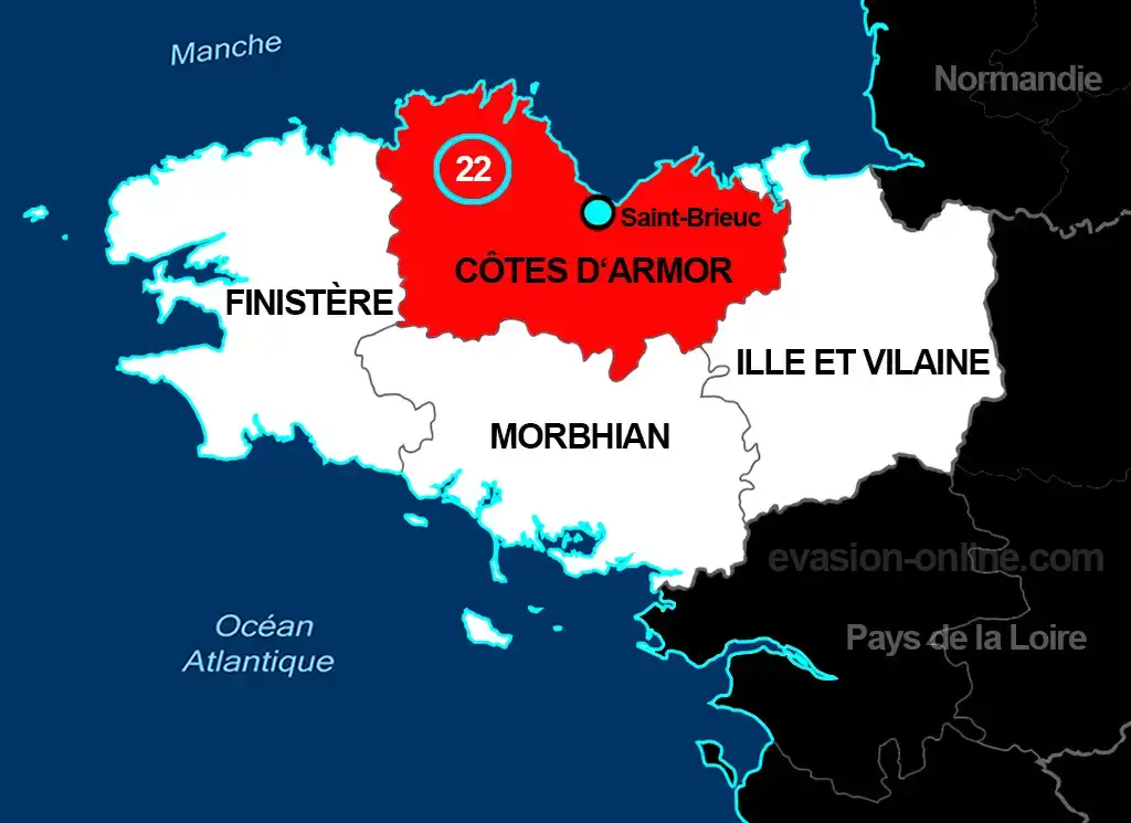 Le département 22 se trouve dans la région de la Bretagne. Plus précisément, il se situe entre l’Ille-et-Vilaine à l’Est, le Morbihan au Sud et le Finistère à l’Ouest et les rives de la Manche au nord.