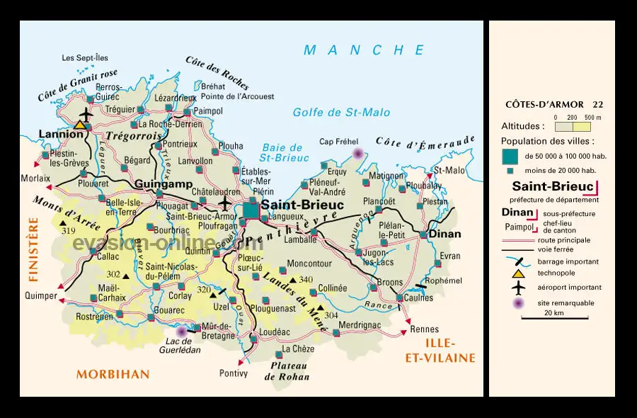 En matière de géographie, ce département de Bretagne couvre environ 7000 km². Sa population est de plus de 590 00 habitants. Le chef-lieu du département est Saint-Brieuc. Les Côtes d’Armor gardent une dominante rurale, avec quelques villes moyennes (Voir carte des villes du département du 22 ci dessous) : Lannion, Dinan, Perros-Guirrec, Trébeurden, Guingamp, Lamballe, Loudéac..