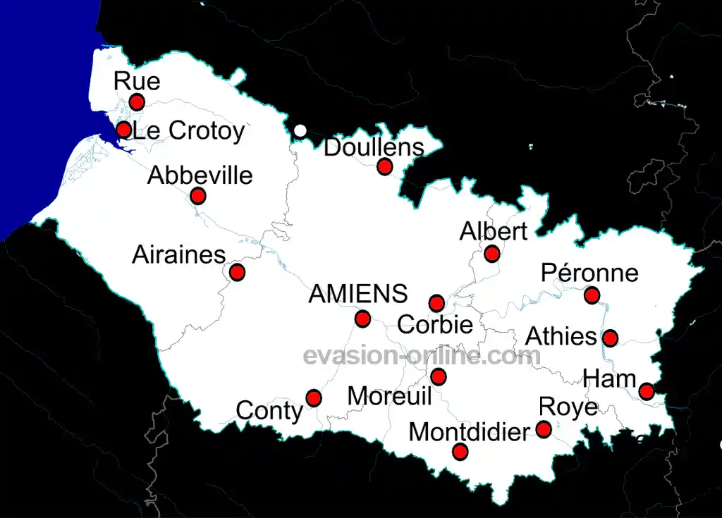 Le département 80 des Hauts de France, offre d’autres attraits comme le parc ornithologique du Marquenterre ou la maison de l’oiseau. La Somme est également connue pour son tourisme balnéaire (Fort-Mahon, Le Crotoy, Cayeux-sur-Mer, Saint-Valéry-sur-Somme). Voir la carte des villes de la Somme ci dessous.