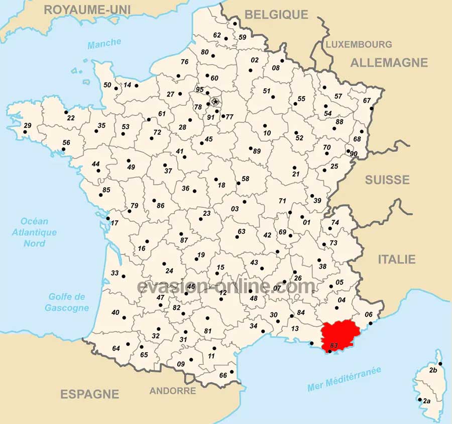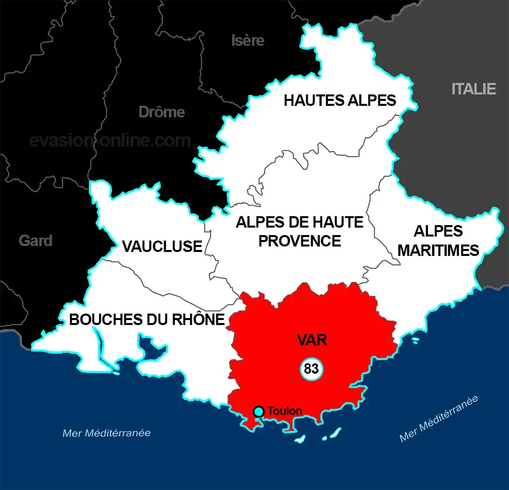 Département français, Numéro 83, le Var se trouve en région PACA . Il est limité au Nord par les Alpes-de-Haute-Provence, à l’Est par les Alpes-Maritimes. Il est bordé au Sud par la mer Méditerranée, et à l’Ouest par les Bouches-du-Rhône.