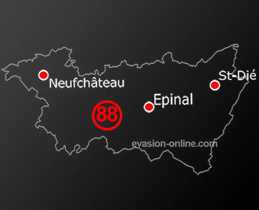 Voir carte des villes du département des Vosges ci dessous. Le 88 recouvre une superficie de 5874 km², et compte environ 380 000 habitants. Le chef-lieu est Epinal. Les principales villes sont Neuchâteau, Saint-Dié, Gérardmer, Mirecourt, Remiremont et Vittel.