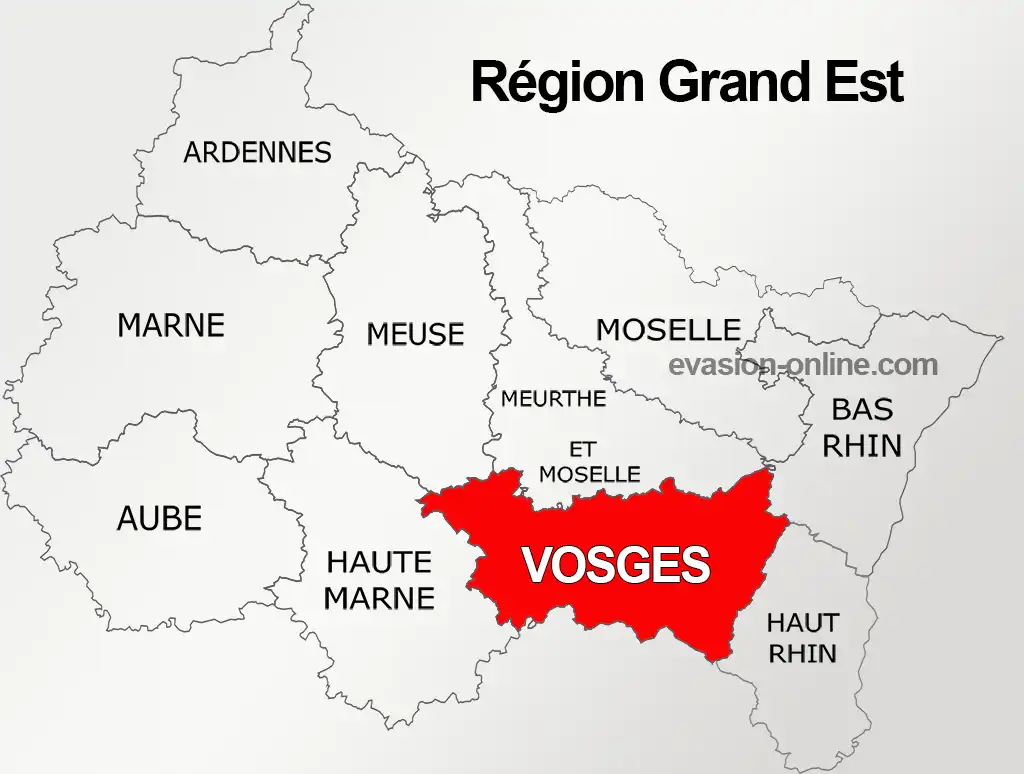 Département français, Numéro 88, de la région Grand Est (ancienne région de la Lorraine), les Vosges, sont limité au nord par la Meuse et la Meurthe-et-Moselle à l’est par le Bas-Rhin et le Haut-Rhin, au sud par la Haute-Saône, et à l’ouest par la Haute-Marne. Voir carte du département des Vosges ci dessus.