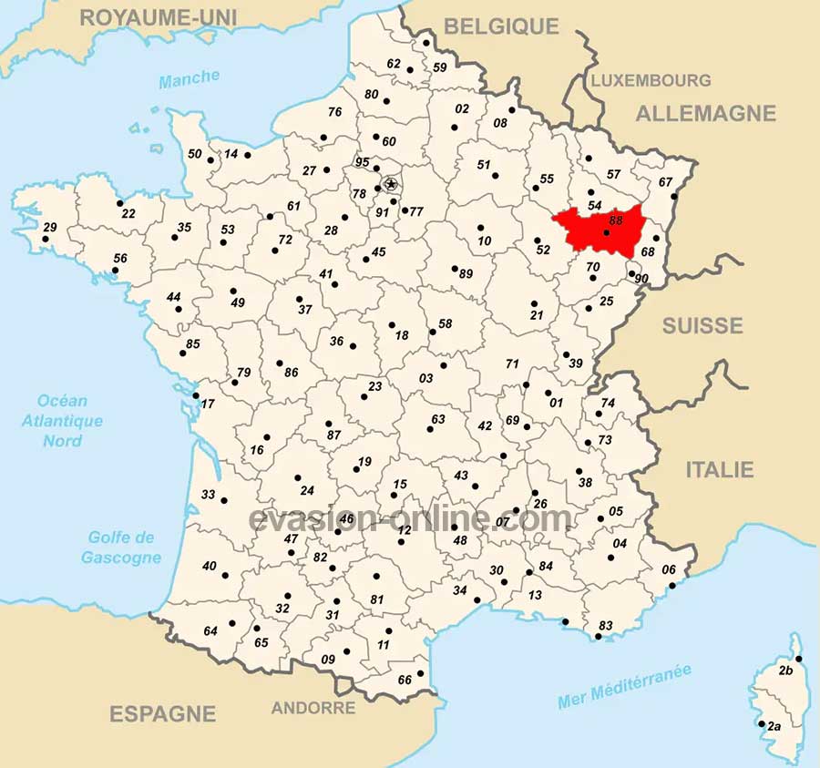 Situé dans le Nord, sur la carte de France, le département du 88 – Vosges – se trouve au Sud-Est de la région de la Lorraine (aujourd’hui Grand-Est).