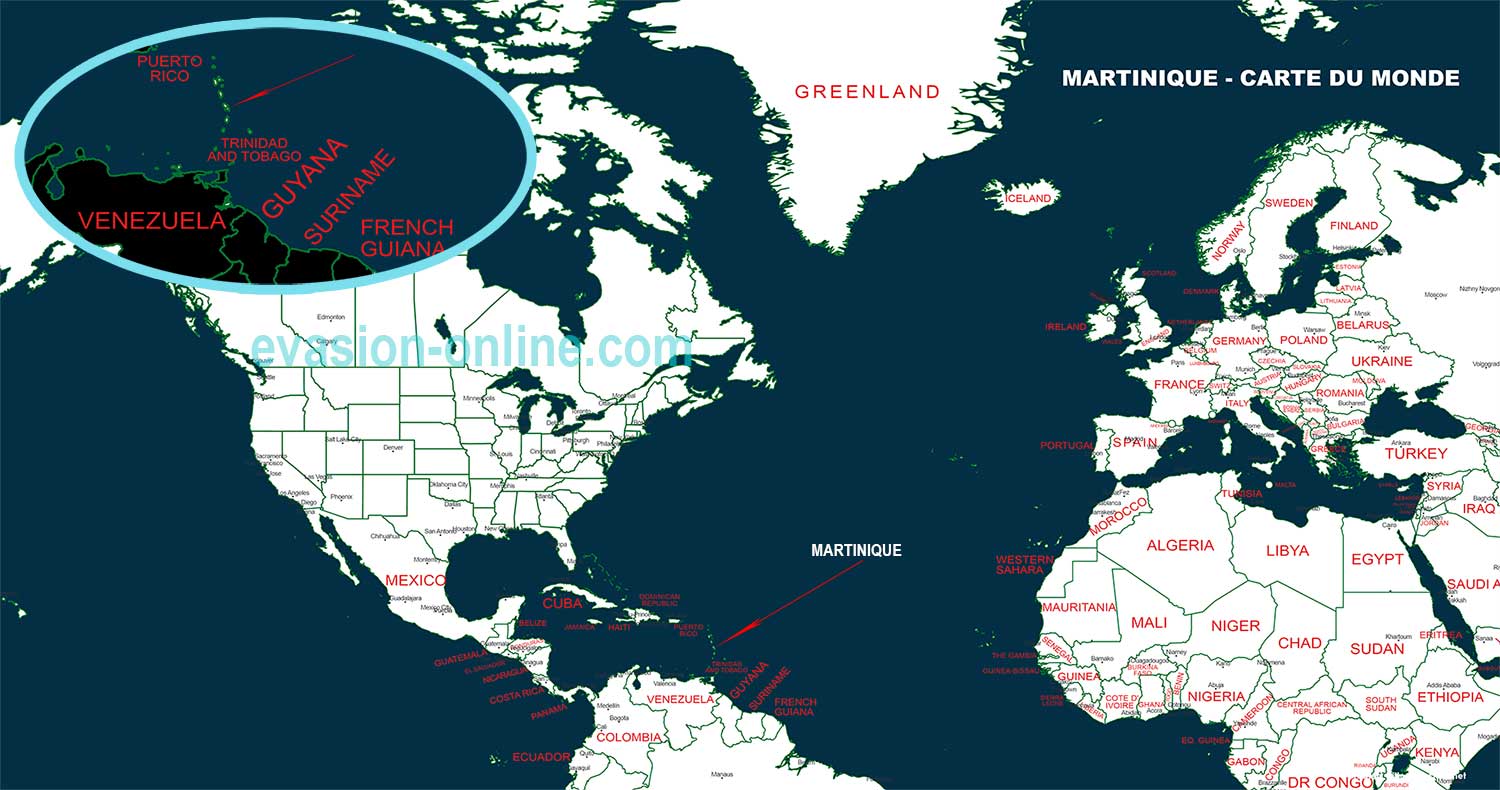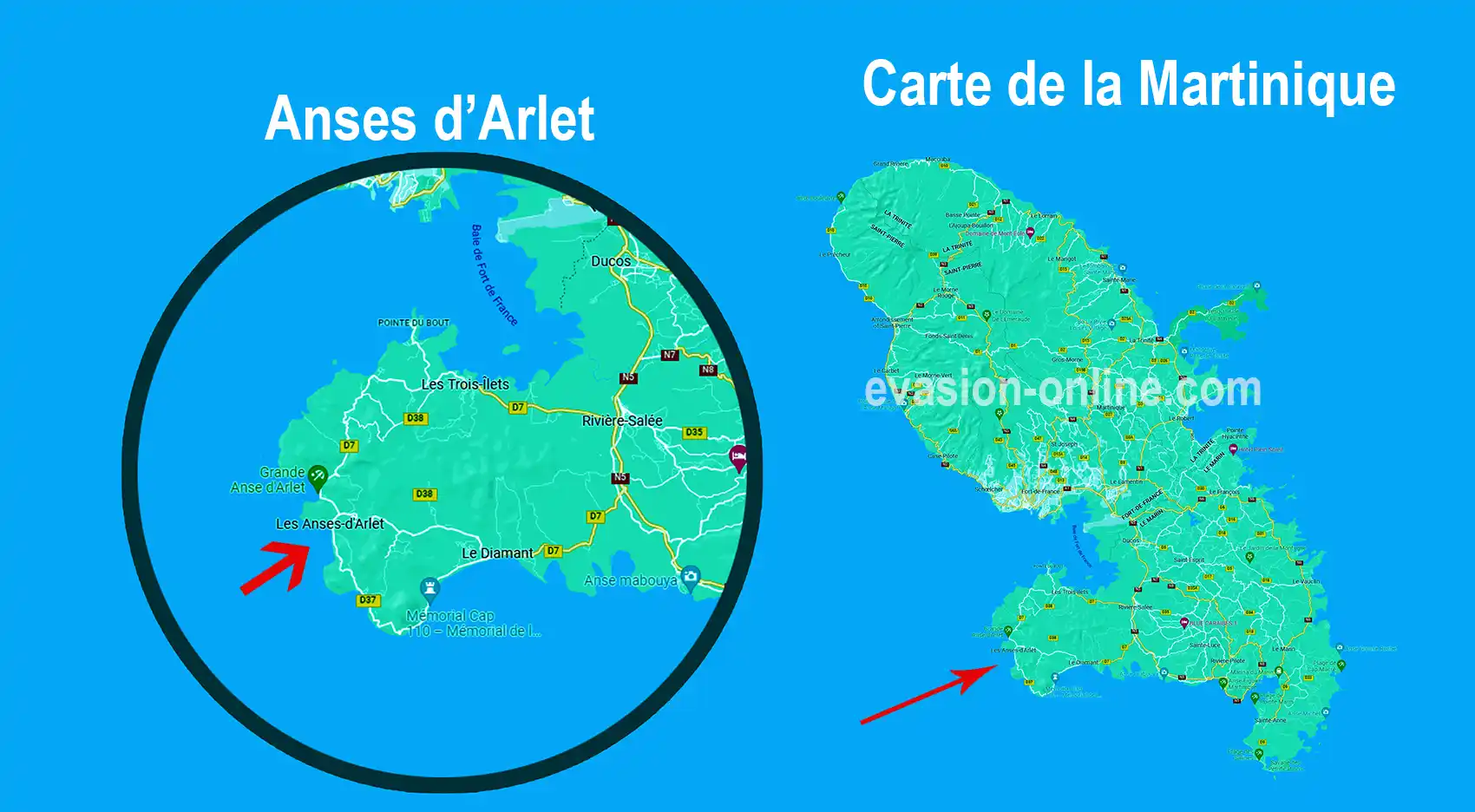 Ci dessus, la carte indiquant où se trouve la Martinique sur la carte du monde. L’île des Antilles françaises est située dans l’est de la mer des Caraïbes. Un territoire insulaire avec les îles voisines de la Dominique au nord-ouest, la Barbade au sud-est et Sainte-Lucie au sud. C’est en Martinique un des plus beau paysages et une des plus belle baie ou plage : les Anses d’Arlet. La plus connue étant sans doute, la grande crique de la plage de Grande Anse Arlet, longue bande de sable blanc.