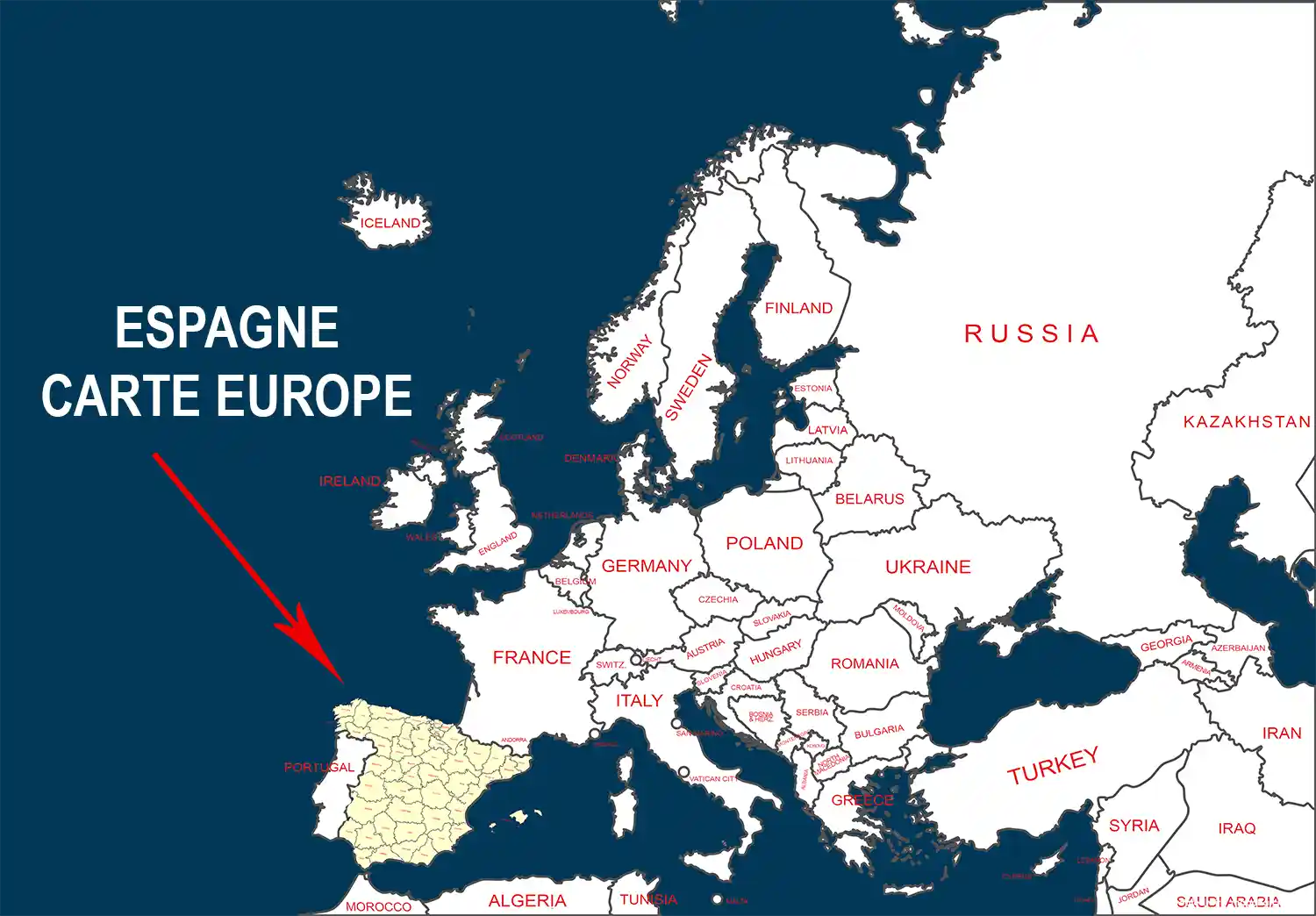 L’Espagne est situé sur la péninsule ibérique dans le sud-ouest de l’Europe. Le pays se trouve entre la mer Méditerranée à l’est et au sud-est, l’océan Atlantique au nord-ouest et au sud-ouest et le golfe de Gascogne au nord. Le territoire espagnol partage ses frontières avec le Portugal à l’ouest, par la France et l’Andorre au nord-est, par Gibraltar et le Maroc au sud. (ou Spain map of Europe).