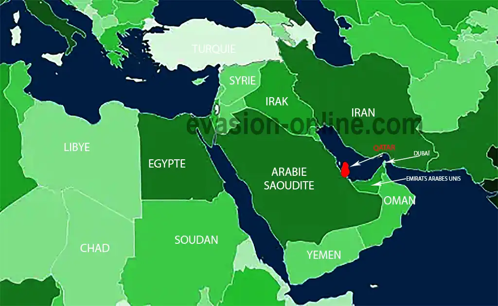 Pour savoir où se trouve le Qatar vous devez situer les Émirats arabes unis, le Bahreïn, l’Iran, l’Irak et l’Arabie Saoudite – voir la carte du monde ci dessous -. Tous ces pays, entourent le petit pays qu’est le Qatar